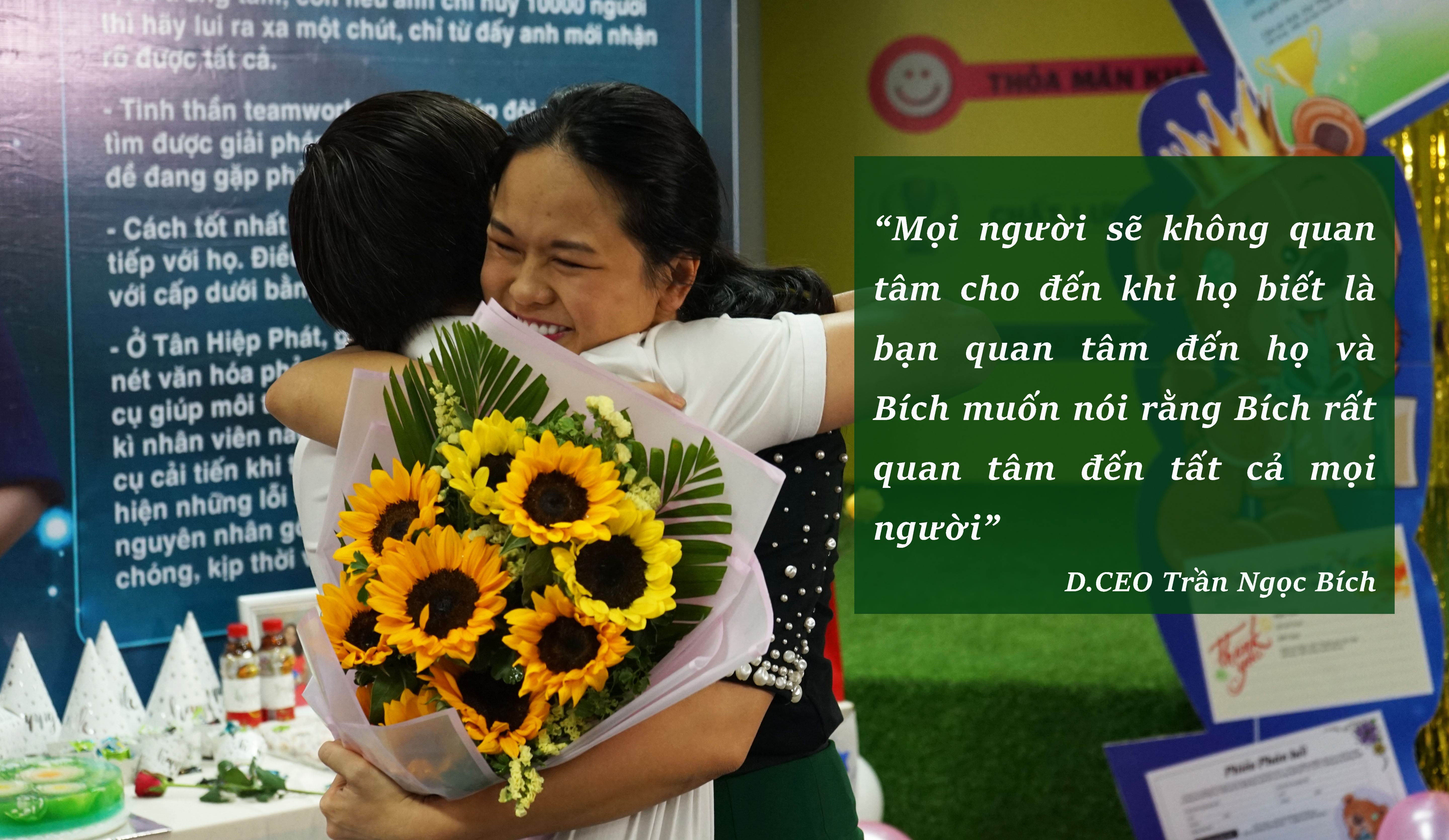 Trong không khí vui vẻ, gần gũi, chị Trần Ngọc Bích tâm sự: “Mọi người sẽ không quan tâm cho đến khi họ biết là bạn quan tâm đến họ, câu nói này chính là động lực và để Bích muốn nói rằng Bích rất quan tâm đến tất cả mọi người. Chính những người xung quanh chính là nguồn lực mạnh mẽ nhất cho Tân Hiệp Phát phát triển. Có những thời điểm Bích nghi ngờ bản thân mình, không biết mình có đóng góp không, nghi ngờ mình có thật sự tạo ra giá trị không, có xứng đáng với những gì mà mọi người dành cho mình không. Và Bích chia sẻ rằng chúng ta hãy nhìn cách hành xử của mọi người dành cho mình để biết được mình đã mang tạo được giá trị cho ai. Đó chính là món quà lớn nhất mà mọi người đã mang đến cho Bích.”