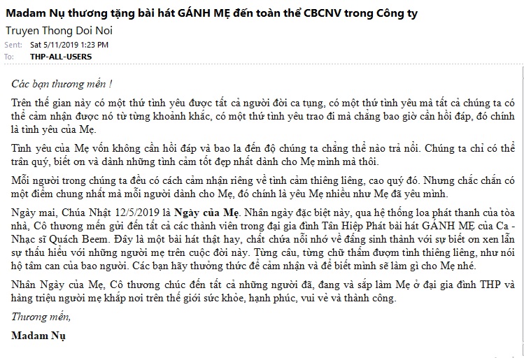 Bài hát vang lên, từng câu, từng chữ thấm đượm tình thiêng liêng, như nói hộ tình cảm của bao người. Nhiều nhân viên đã không ngần ngại, chia sẻ cảm xúc của mình lên mạng xã hội Facebook.
