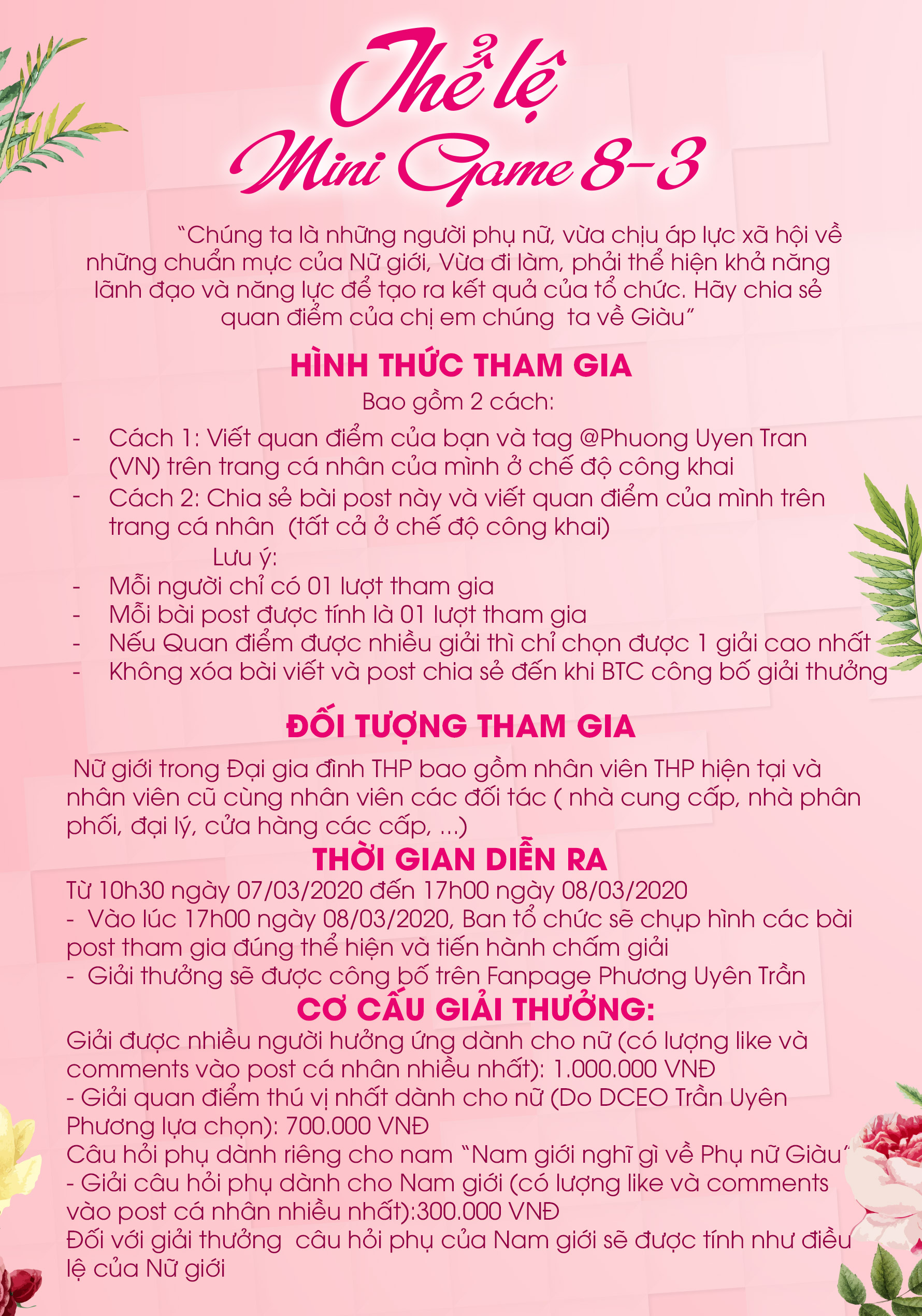 Minigame 8-3 dành cho đại gia đình THP cùng tham gia. Theo dõi chi tiết ở phía dưới nhé!