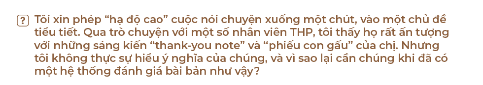 THP tin rằng nếu bạn làm tốt, đồng nghiệp nhìn thấy nhiều hơn là cấp trên. Cấp trên dù rất sâu sát cũng chỉ thấy 60%, có những điều đồng nghiệp thấy cấp trên không có thấy. Những điều các bạn làm tốt mà cấp trên không biết, sẽ có người khác ghi nhận.
