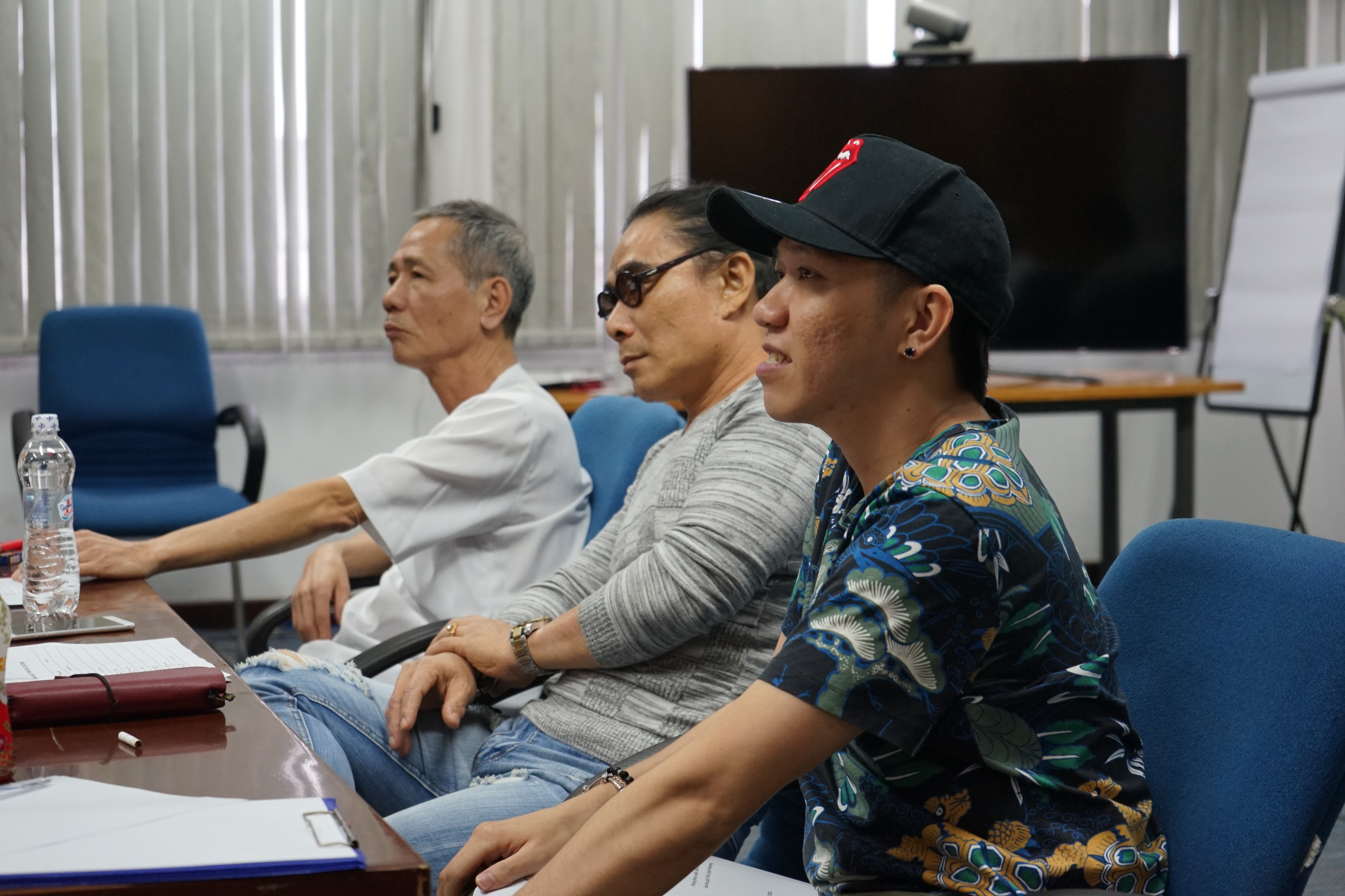 Nhà biên kịch Lê Chí Trung, đạo diễn Phùng Nguyên và đạo diễn Anh Đức (theo thứ tự từ trái sang phải) tại buổi tuyển diễn viên nội bộ Tập đoàn Tân Hiệp Phát.